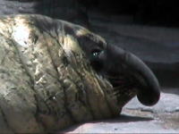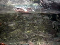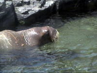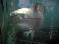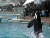 形が奇妙なことから,マンボウを知らない人はきっといないでしょう。でもなかなか生体を見る機会はないと思います。 水槽内をゆっくりクルクル回っているだけなのに,どれだけ見ていても愛嬌のある表情と上下の鰭を使ったゆったりした泳ぎ方が,なぜか大海原をゆったり目的もなしにさまよっているような光景を想像させてくれます。 水槽には,壁にマンボウがぶつかったりしないようにビニールカーテンがつけてありました。 鴨川シーワールドと言えば・・・・・シャチ! 巨大なシャチが曲芸を披露してくれます。ちょうど私が行ったときには,当館生まれの子シャチがデビューしていました。