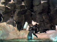 『南極の海』 いよいよ目玉の展示。ペンギン展示室です。人口降雪機の下に陣取って立っているペンギンがひょうきんに見えれば,手前の水槽を俊敏に泳ぐペンギンが勇ましく見えます。