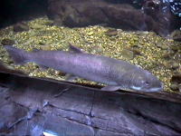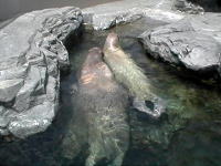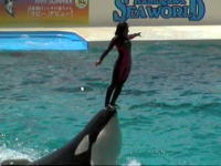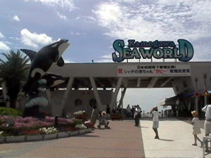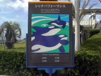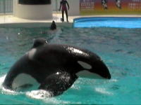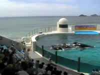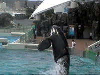 形が奇妙なことから,マンボウを知らない人はきっといないでしょう。でもなかなか生体を見る機会はないと思います。 水槽内をゆっくりクルクル回っているだけなのに,どれだけ見ていても愛嬌のある表情と上下の鰭を使ったゆったりした泳ぎ方が,なぜか大海原をゆったり目的もなしにさまよっているような光景を想像させてくれます。 水槽には,壁にマンボウがぶつかったりしないようにビニールカーテンがつけてありました。 鴨川シーワールドと言えば・・・・・シャチ! 巨大なシャチが曲芸を披露してくれます。ちょうど私が行ったときには,当館生まれの子シャチがデビューしていました。